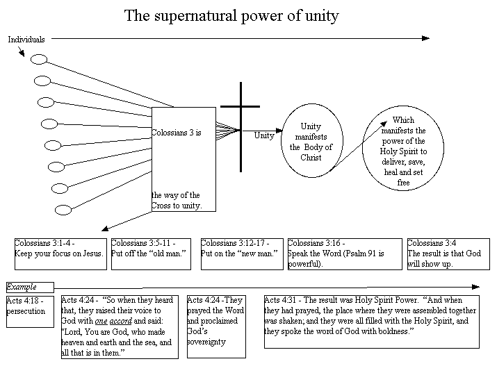 The Holy Spirit works powerfully through the unity of believers in the church. Jesus prayed in John 17:20-23 that the world would know Gods love through Jesus Christ when believers came into unity with one another. When believers come into unity, they manifest a small mosaic piece of the Body of Christ. The result is the Holy Spirit is unleashed to do what He does best. The Holy Spirit lifts the veil from the eyes of unbelievers, sets prisoners free, and heals the brokenhearted. The Holy Spirit makes Jesus real to us and to the world around us. He makes us whole, spirit, soul, and body, and sends us out to proclaim the Good News to others. I feel that this picture is worth a thousand words.