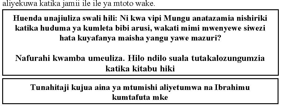 Maneno ya Mungu katika Mwanzo 24:4-9 yanasema, “bali enenda hata nchi yangu, na kwa jamaa zangu, ukamtwalie mwanangu Isaka mke. Yule mtumishi akamwambia, Labda yule mwanamke hatakubali kufuatana nami mpaka nchi hii, je! Nimrudishe mwanao mpaka nchi ulikotoka? Ibrahimu akamwambia, Ujihadhari, usimrudishe mwanangu huko. BWANA, Mungu wa mbingu, aliyenitoa katika nyumba ya babangu, na kusema nami katika nchi niliyozaliwa, aliniapia akisema, Nitawapa uzao wako nchi hii; yeye atampeleka malaika wake mbele yako, nawe utamtwalia mwanangu mke tokea huko; na yule mwanamke asipokubali kufuatana nawe, basi, utafunguliwa kiapo changu hiki; lakini usimrudishe mwanangu huko. Yule mtumishi akaweka mkono wake chini ya paja la Ibrahimu bwana wake, akamwapia katika neno hilo.”