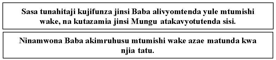 Kitabu hiki ni mali ya International School of the Bible. Kinaweza kuchapishwa tena, iwapo tu kitachapishwa chote, kwa ajili ya kukisambaza bure (bila malipo). Hairuhusiwi kukibadili au kukihariri kwa njia yoyote ile. Kikichapishwa tena ni lazima kiwe na tangazo la haki miliki (“Copyright © 2001 ISOB”). Kitabu hiki kisiuzwe (au kutumika kutangazia ubora wa bidhaa yoyote iliyokwishauzwa) bila ruhusa ya International School of the Bible (ISOB).